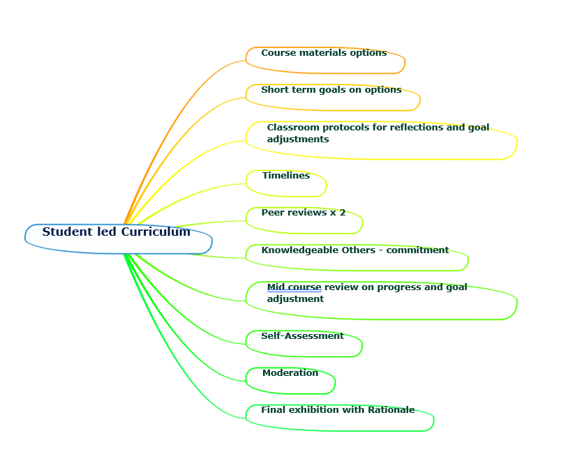 Learning: Student- Led Curriculum would need a set time to establish what the goals are, a structure for selecting worthy topics, which are moderately difficult or challenging but attainable with required effort, and establishing a process of monitoring, and final delivery.
