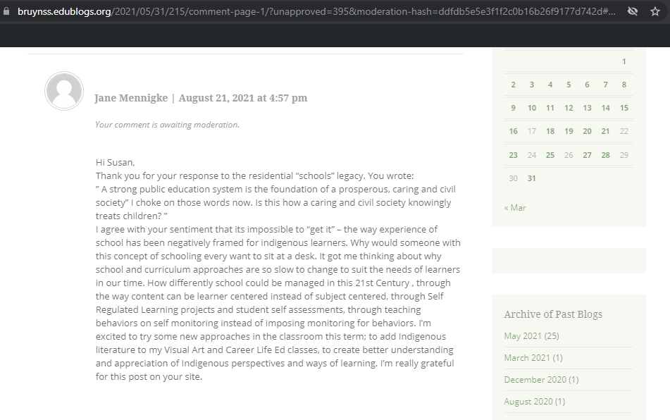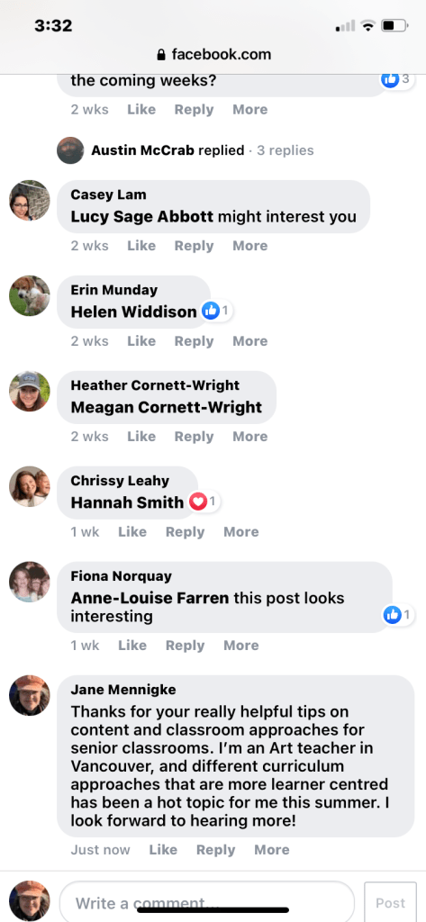 I responded to Ms Bruyns article on the disheartening learning barriers facing residential school survivors and younger generations. Learners with the backdrop of residential schools, who are retraumatized by the school environment and through ongoing evidence following the unmarked graves discovery in Tk’emlúps te Secwe̓pemc First Nations. Her appeal is to raise awareness of these learning barriers to engage creativity. In my post I reflected on the need for student centered curriculum approaches to change how students experience the classroom. I could have written of some more practical examples. This question I still need to fully engage with myself. There is a lot more I could do in my own classroom. I am not sure if she will respond or not.